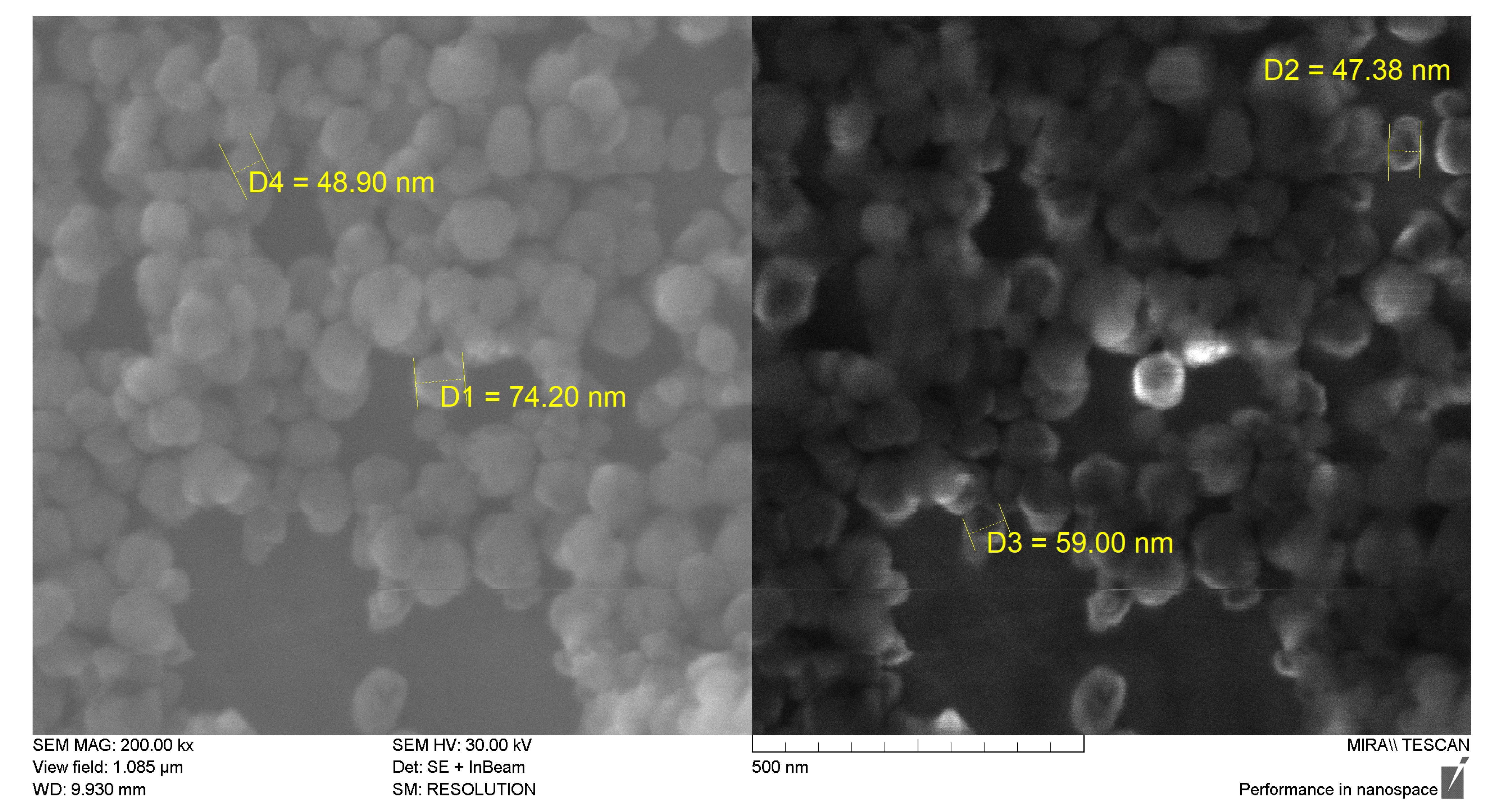 The NPs were then washed three times with ethanol and dried. UCNP images (Fig. 1), obtained using the field-emission scanning electron microscope (SEM) MIRA 2 LMU (TESCAN, Czech), were used for particle morphology and size assessment. The average size of UCNPs was measured using ImageJ software.