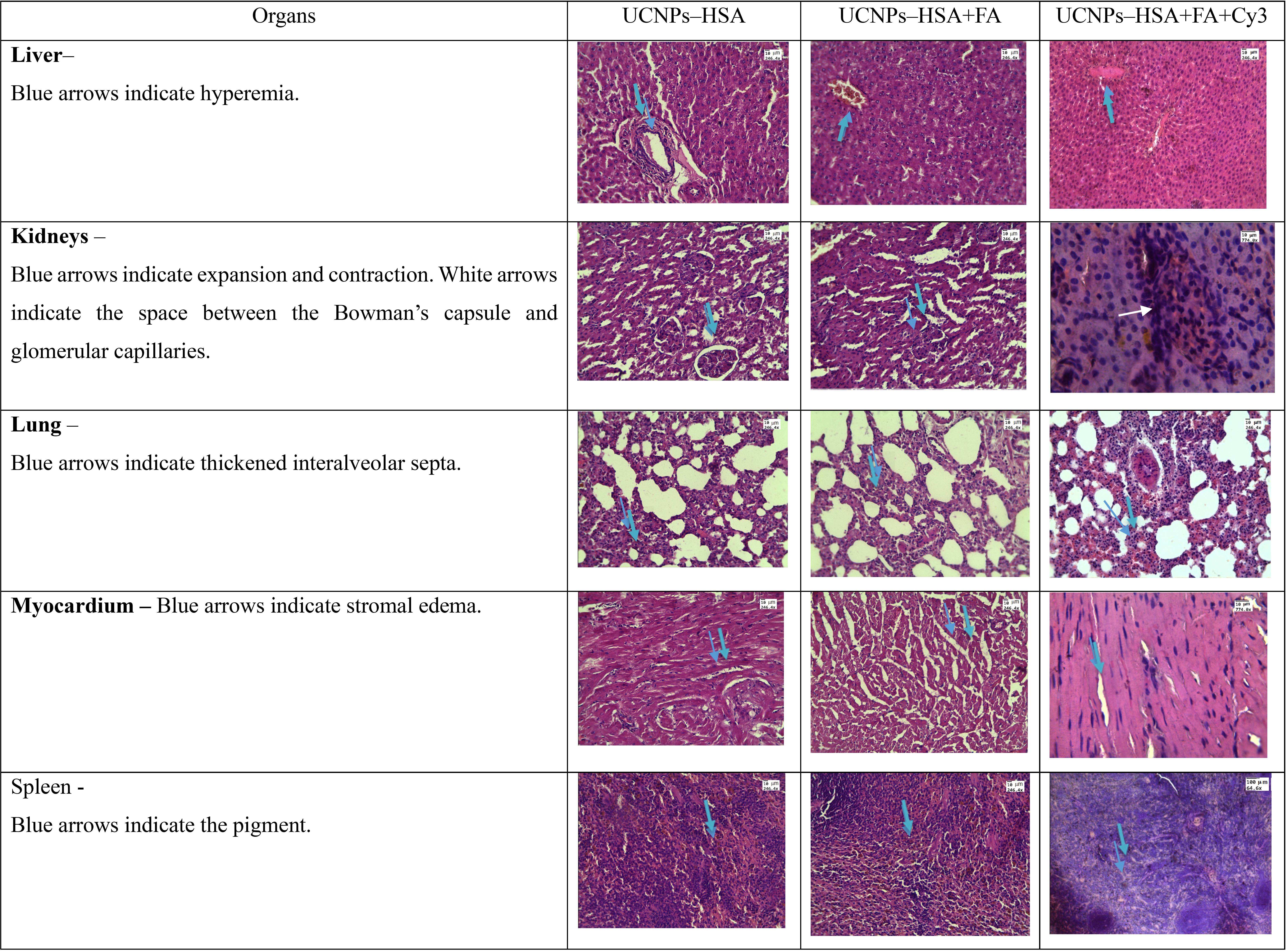 It was found that the NPs accumulated more in tumors. When using UCNPs-HSA and UCNPs-HSA+FA, similar changes were detected in rat organs. There were differences in the kidneys depending on the type of particle that was used. When UCNPs-HSA+FA+Cy3 particles were injected into the internal organs, signs of circulatory disorders and minor morphological signs of kidney damage were observed.