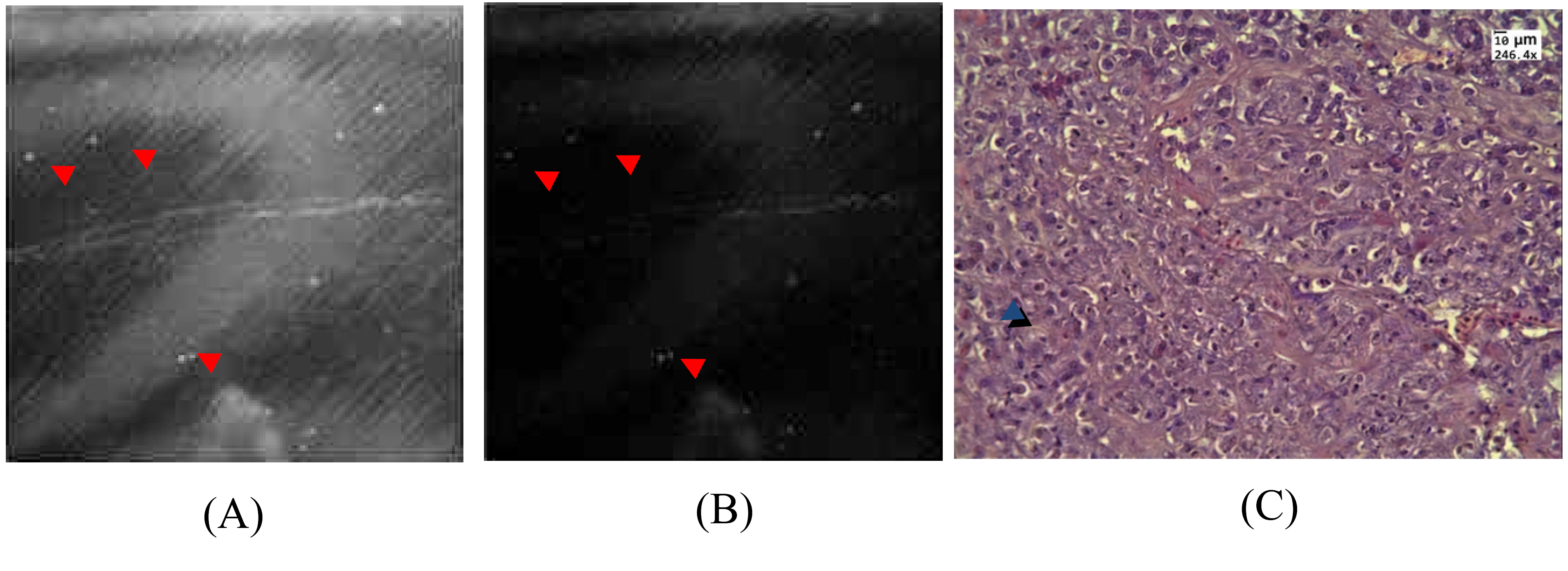 (A) Example of tumor sample after intravenous UCNPs–HSA+FA injection. Arrows indicate particles. (B) Image after processing. Red arrows indicate particles. (C) H&E-stained sections of the tumor obtained under a light microscope (10% necrosis). Blue arrow indicates necrosis.
