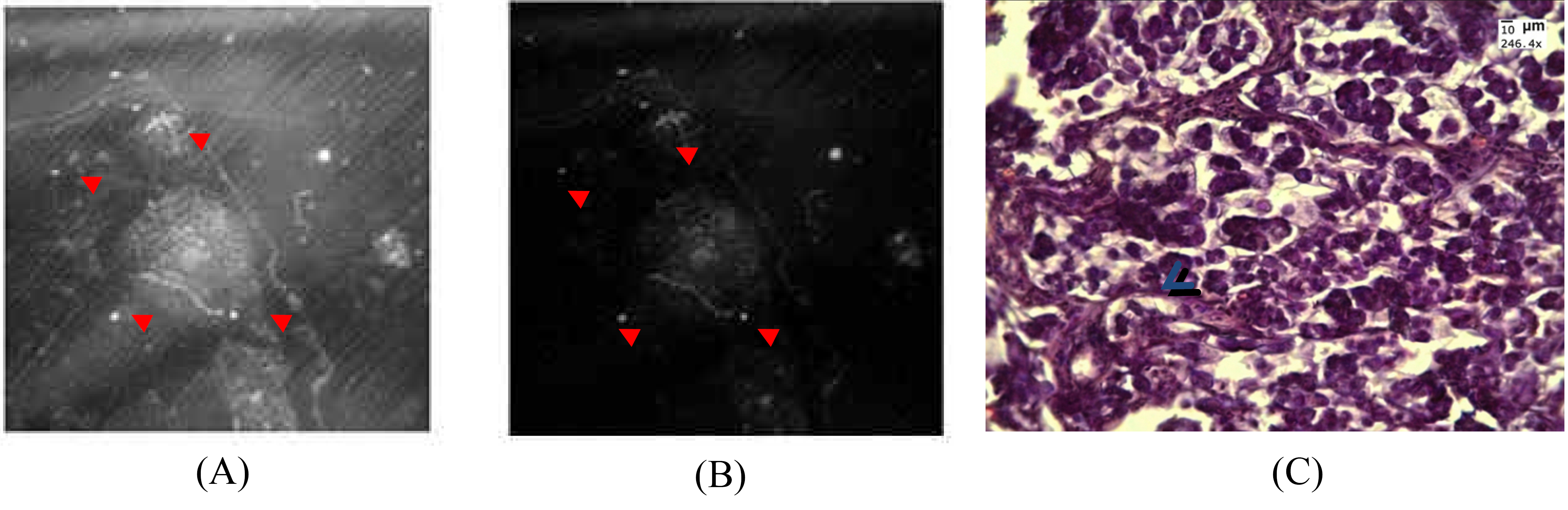 (A) Example of spleen sample after intravenous UCNPs–HSA+FA+Cy3 injection. (B) Image after processing. Arrows indicate particles. (C) H&E-stained sections of spleen tissue, interspersed with particles indicated by the arrow.