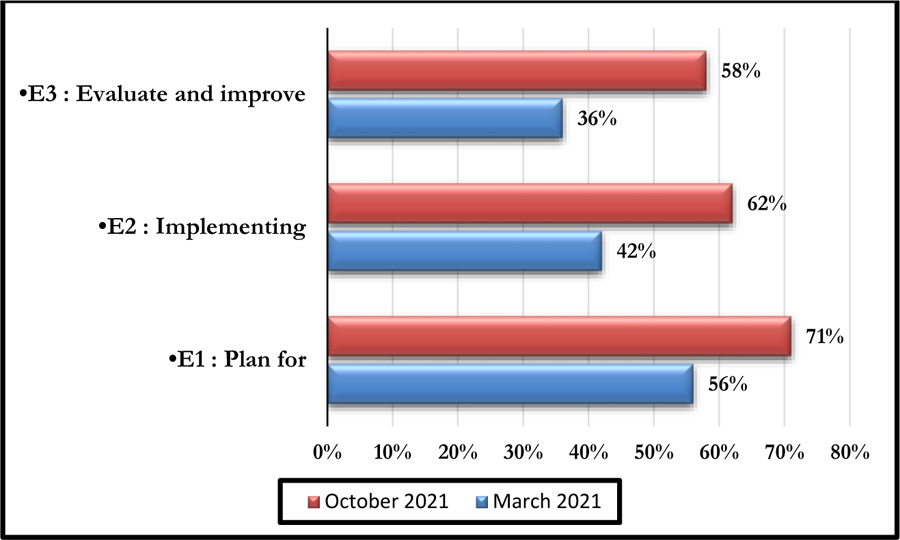 Between March and October 2021, an improvement in the scores for almost all the axes of the two self-assessment tools was noted. Indeed, the score of the self-assessment for the High Authority of Health reference system rose from 44% in March 2021 to 63% in October 2021, i.e. an increase of 19%, and that of the Guide of the Good Practices of Biomedical Engineering increased from 67.54% in March 2021 to 80.96% in October 2021, i.e. an increase of 13.42%.