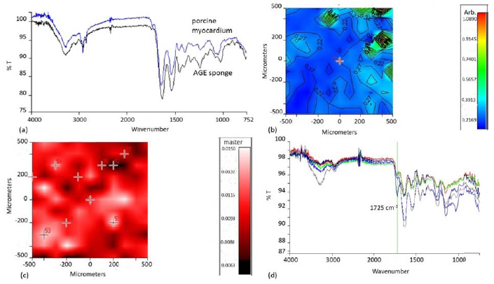 To further characterize similarities between AGE sponges and native tissue, the band ratio between the typical polysaccharide adsorption peak and the typical protein adsorption peak was calculated (Fig. 4b). This value was in the range 0.22-0.27. The same analysis was carried out on a sample of healthy porcine myocardium and the band ratio was equal to 0.29. This result further confirmed that our attempt to produce a biomimetic scaffold mimicking the chemical composition of native myocardium was successfully achieved.