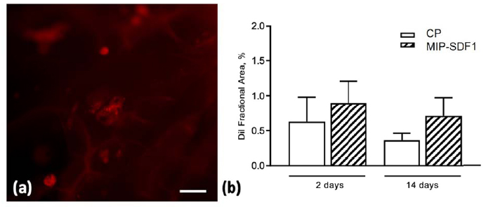 CM-DiI labelled rCPCs seeded on AGE scaffolds with CP or MIP-SDF1 were evaluated at 2 and 14 days after plating. Quantification of cell adhesion was performed by computing the fractional area occupied by CM-DiI fluorescent rCPCs using “Image Pro Plus 4.0” software [27].