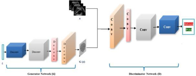 Fig. (2) shows the architecture of DCGAN. The generator network G uses z as an input noise vector and passes it through multiple deconvolutional layers to generate a synthetic ultrasound image represented as G(z). The output of the generator network and training images are fed to discriminator network D to classify them into real and fake images. The discriminator network consists of multiple convolutional layers.