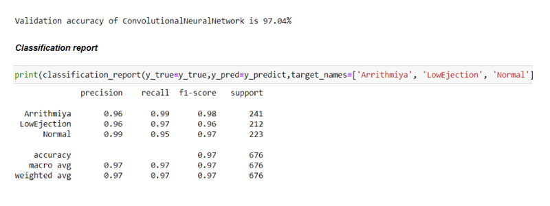 In this research, the datasets used are benchmark. Echocardiogram videos are converted into frames by Data Preprocessing techniques that is feature extraction is done once the video datasets are converted into frames which are randomly selected for the input process, and then there is 80% of the data is used for training and 20% of the data is used for testing the data by making use of the CNN Module which consist of an Input layer, Hidden layer, and output layer in which the RELU activation function is used once the testing data is done it is used for classification the used input frames and is going to display the classification as a) Normal- 60-70 HB/min b) Low-ejection-40-50HB/min c) Arrhythmia -Below 30 HB/min (Fig. 2).