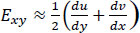 Eqs. (2-4) calculate strain as a sum of specific displacement gradients. As these derivatives are small, when multiplied against one another or squared, their terms subsequently become effectively negligible. Thus, (2-3), and (4) can be simplified. These equations are subsequently referred to as engineering strain tensors (See: Appendix A).