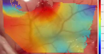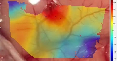 Analysis of the craniotomy videos revealed that strain maps throughout all four datasets were consistently aligned with surface topography and blood vessels. Fig. (9) demonstrates the shear strain from frame 139 of the Metastatic Tumor dataset [8]. Note that the transparency in this data plot was increased to emphasize those regions of strain which had a magnitude greater than 2%. The legend on the right notes that the darker red and darker blue sections of Fig. (9) had magnitudes between 0.04 (4%) and 0.06 (6%).