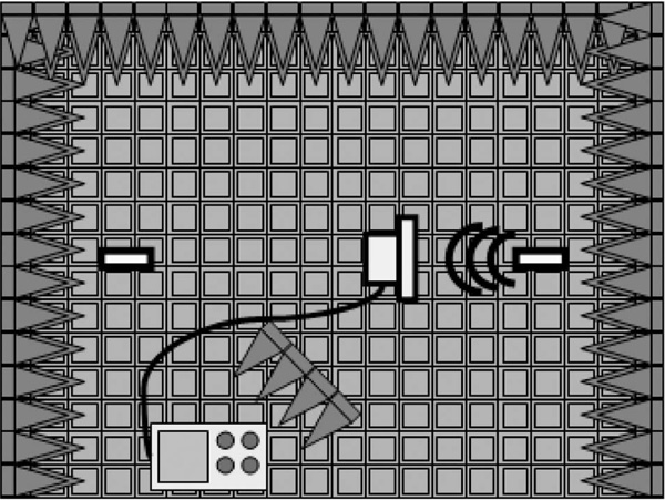 Test setup inside full anechoic chamber. Emission level read at distances away from transmitting PDA while receiving PDA on opposite side of room.