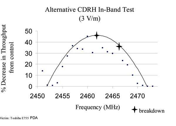 Testing the 802.11b channel 11 link against a Bluetooth interferer (Test 5) at the same center frequency (2462 MHz) revealed similar results to our ‘CDRH SF Threshold Test’. At 0.5 V/m there was a 35% decrease in throughput. Field strengths of 1.0 V/m and higher caused breakdown. Based on our emission measurements, the average Bluetooth device would need to be closer than 10 cm of the 802.11b link to cause breakdown status. This is a worst-case situation because the interfering Bluetooth signal was tested at the 802.11b’s center frequency. In real-life devices the Bluetooth signal would be hopping in a 79 MHz wide band from 2402 MHz to 2480 MHz and would not reside at the 802.11b’s center frequency for more than 625 microseconds.