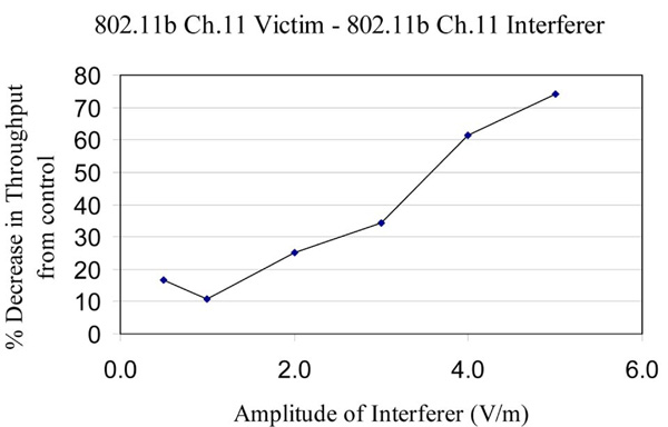 Testing the 802.11b channel 11 victim link against an 802.11b signal (Test 4) at the same center frequency performed better than our ‘CDRH SF Threshold Test’. Although some decrease in throughput was observed at 0.5 V/m, breakdown did not occur until above 5 V/m. As shown in Table 1 the average 802.11b device would need to be closer than 10 cm to emit an electric field strength of 5 V/m. Throughput was recorded from 0.5 V/m up to 5 V/m and is shown in Fig. (3). Testing the 802.11b channel 11 victim link was also performed for 802.11b interfering signals at 2457 and 2437 MHz. These represent the neighboring channel 10 and the first non-overlapping channel 6, respectively. Against channel 10 the victim communication reached breakdown status at 4 V/m. According to our emission measurements the average 802.11b device would need to be closer than 10 cm to emit an electric field strength of 4 V/m or greater. No breakdowns occurred for interfering source channel 6, but for fields of 10 V/m a 30% decrease in throughput was measured.