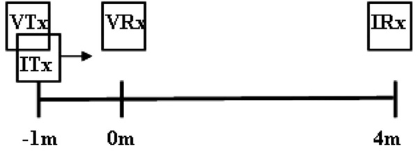 Top view of Anechoic Chamber setup. VTx stands for the victim link’s transmitter, VRx for the victim link’s receiver, ITx for the interfering link’s transmitter, and IRx for the interfering link’s receiver. ITx is moved from (-1 m) through VRx (0 m) up to (3.5 m).