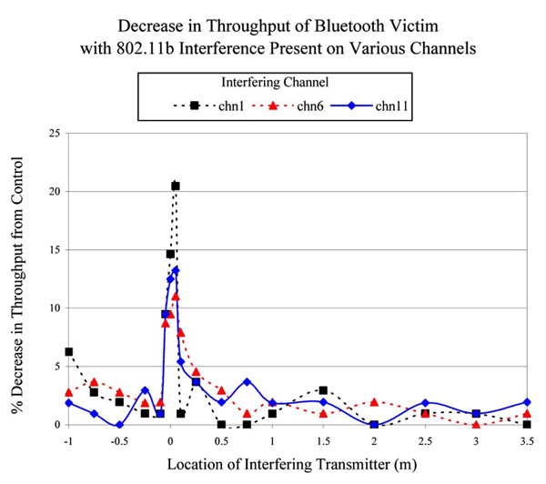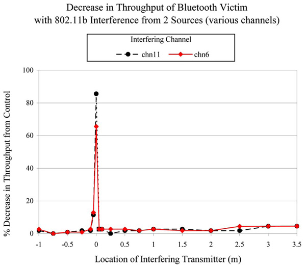 Next an 802.11b victim on channels 1 and 6 was tested against the interfering PDA Bluetooth connection (Test 2). Both channels behaved similarly, with decreased throughput only when the interferer was within 5 cm of the victim receiver. The maximum decrease in throughput was observed from channel 1 at 21%. A 5% variation in the control cases was measured.