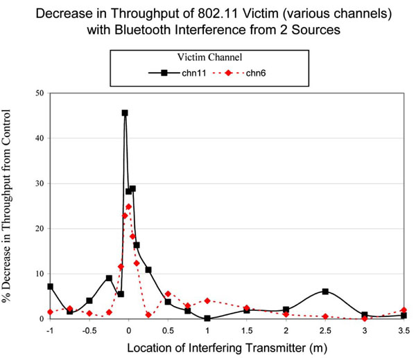 Fig. (7) shows testing of a Bluetooth victim against two separate 802.11b interferers (Test 5). The important parameter in these tests was the relative location between the receiver and transmitter. When the victim receiver was on top of the interfering transmitters, the Bluetooth connection could not be established while the 802.11b communication was possible. The variation of the control case was less than 3%.