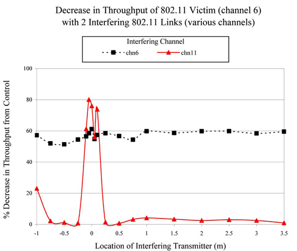 Fig. (5) shows testing of the 802.11b channel 11 victim link against an interfering signal of 802.11b on channels 6, 8, and 11 (Test 1). When the interfering signal was on channel 6, the only significant decrease in throughput (26%) came while the interferer was on top of the victim receiver. This is expected since channel 6 does not overlap channel 11. When the interfering signal was changed to channel 8, a communication breakdown occurred when the interfering transmitter was brought within 5 cm of the victim receiver. It was only after the interfering signal was manually stopped that transmission would restart. However, when the interferer was the same channel as the victim, channel 11, the communication was never lost, but had a considerable decrease in throughput (31-48%) regardless of the position of the interferer. The three control cases showed a variation less than 2%.