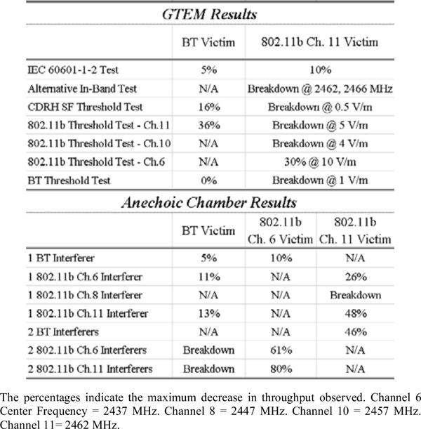 The first half of Table 2 shows a summary of worst-case findings from tests done in the GTEM. It shows how the Bluetooth and 802.11b victims responded to all of the different interfering sources. The percentages indicate the maximum decrease in throughput observed.