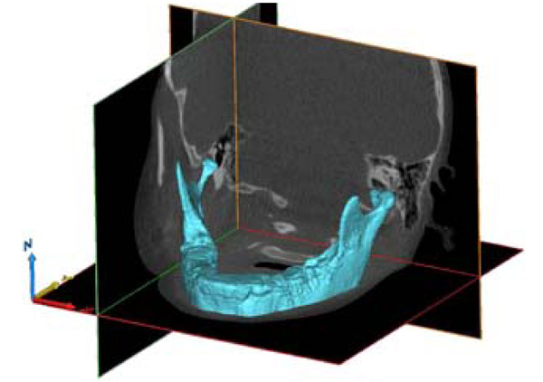 MIMICS was then used to calculate a 3-D object, from the default menu, for the two associated masks using pre-defined high quality settings that preserve the integrity of the virtual models (see Fig. 2). A grey value interpolation scheme was used to account for partial volume effects in the voxels. This produces a surface that is generally more accurate versus a contour interpolation method. The contour method draws contours on the boundaries slice by slice, interpolating linearly between each slice, hence ignoring partial volume effects between the contours. The 3-D virtual models were then smoothed using a voxel based technique with an existing MIMICS algorithm to preserve calculated volumes. Preservation of 3-D volumes were verified by comparing before and after volumes. Implementation of the same algorithm on each of the scans ensured minimal subjectivity. In contrast to other literature on mandible segmentation [23,26], there was no manual segmentation implemented – as manual segmentation is time consuming and prone to errors. MIMICS is then used to export STL files of the two 3-D models.