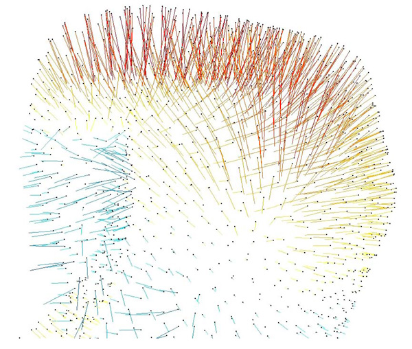 3-D vector map, on the right condyle, illustrating deviations of the surface meshes from the 2008 to 2009 models. Red-yellow indicates a positive change between nodes on the surface mesh, blue-green indicates a negative change.