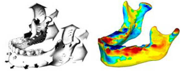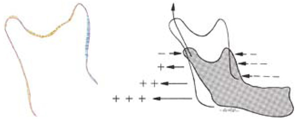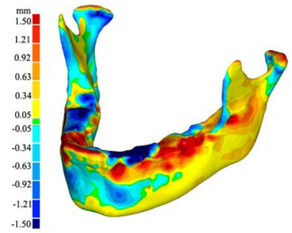 Study growth map (right) shown to be in conformity to similar maps found in literature [4] (Left). The arrows contained in the literature sample indicate relative growth direction and magnitude using the relative size and direction of the arrows. The colour map of the growth map image is the same as in figures 4 and 5. As seen, our growth visualization shows inward growth near the symphysis (upper chin) with outward growth along bottom of chin, body and ramus. Additionally, in both visualizations, the proximal side of the ramus show resorption whilst the distal side shows deposition. An interesting detail poorly captured in literature is the resorption anterior to the condyle, making the process more pronounced.