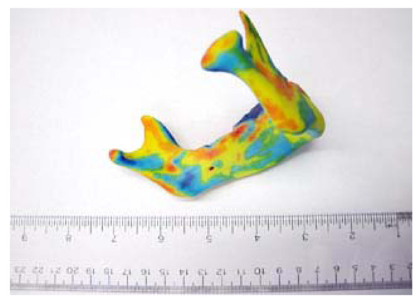 The growth study is followed up with the creation of a 3-D physical model, a novel and unique way to visualize the growth of the mandible. A growth map from the study was printed on a colour 3-D printer utilizing a rapid prototyping technique similar to Russett et al. [25], allowing a “graspable” physical model representing the growth of the mandible over a year. This was accomplished using the VRML file, which allows a 3-D printer to print the surface mesh with associated colours. The production of a physical model has great benefits for the use of explaining and conveying information.