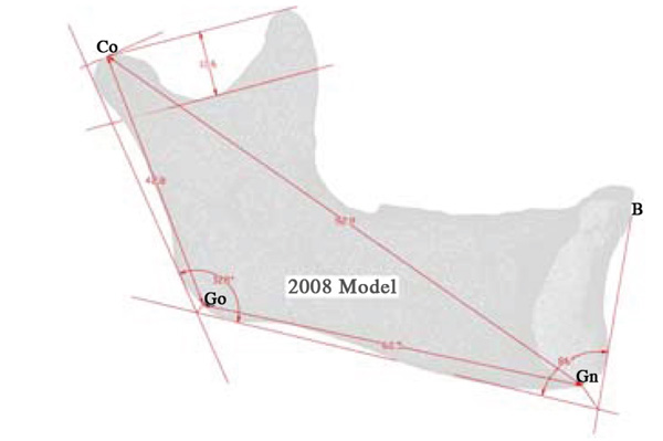Maximum recorded growth (ignoring the areas affected by the artifacts) between the 2008 and 2009 virtual models is 1.67 mm on the condyle, while the maximum resorption is 1.0 mm adjacent to the symphysis (most anterior part of the mandible). The overall width of the mandible, measured from the medial side of the condyle, increased by 0.49mm - an increase of 2.8% over the year. Table 3 is data obtained by comparing the indices defined by aforementioned landmarks [29]. In addition to the data presented in Table 3, there is another angle formed between the corpus and the symphysis plane that remained constant at approximately 85 degrees. Fig. (8) illustrates various 2D parameters superimposed on a sagittal view of the 2008 mandible model, showing the landmarks used to extract the data [29].