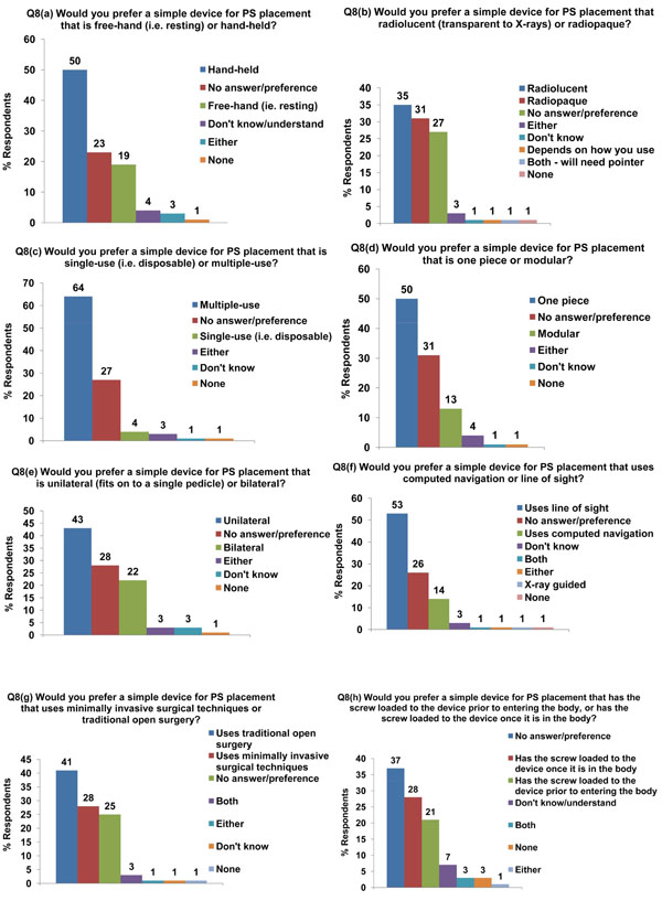 This question consisted of 8 sub-questions that provided the answers in Fig. (3). There was no clear consensus in the answers given; however, if the majority opinion is taken for each of the design factors in Question 8, then the overall preference was for a device that is multiple use, one-piece, hand-held, radiolucent, unilateral and uses the line of sight principle in traditional open surgery, with no preference as to whether the PS should be loaded into the device before or after entering the body.