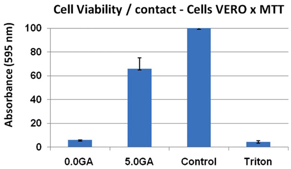 Cell viability of VERO cells cultured in direct contact with PVA/BaG hybrids not cross linked and cross linked with 5wt(%) of glutaraldehyde.