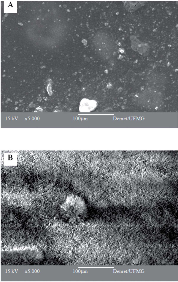 The surface changes of the hybrid matrix upon immersion in an SBF solution for 7 days were evaluated by SEM analysis (Fig. 3). To draw a comparison, samples immersed in water were also analyzed. These samples presented a regular surface with an integral aspect, indicating the resistance of the samples to rapid degradation when in an aqueous medium for 7 days. On the other hand, the surface of the samples immersed in SBF presented a pronounced morphological aspect, indicating the presence of particles in the shape of needles covering the entire visible region. This aspect is compatible with the calcium phosphate deposited in the treated materials, as have been observed for many bioactive materials.