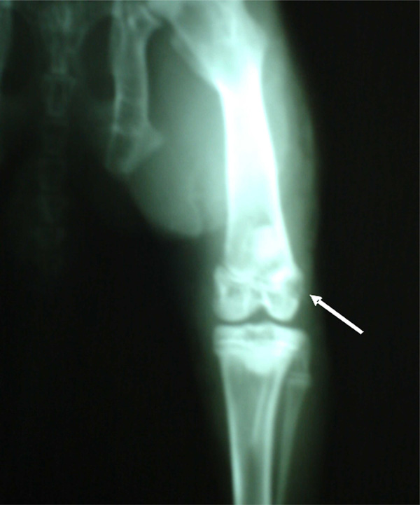 Image obtained in Multislice CT scanner Toshiba (16 slice) shows a bone lesion in a rabbit femur according to material and method. A radiolucent image with cortical erosion in distal femoral epiphysis of right condyle is observed. Dense image interpreted as signs of incipient integration-regeneration. No swelling of soft tissue is seen.