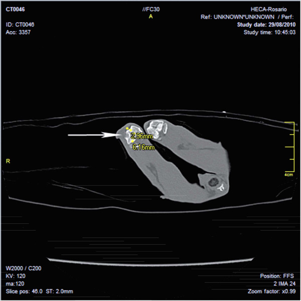 After surgery, radiological studies were immediately carried out on all rabbits, in an attempt to view the lesion and/or the implant at a radiological level (see Fig. 4). As post-surgical control, night and day temperatures studies, as well as hemograms, were performed according to conventional techniques, the grade of food, and the water intake. Tomographic studies, using a Toshiba multislice 16 detectors scanner, were performed at the end of the experiment (45 days).