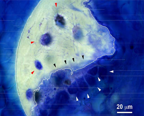 Toluidine Blue-stained histological section of the distal femur. Several active cuboidal osteoblasts can be observed (white arrowheads) as well as newly deposited osteoid (black arrow heads) and embedded osteocytes (red arrow heads). A piece of calcified trabecular bone (white line) can be observed.