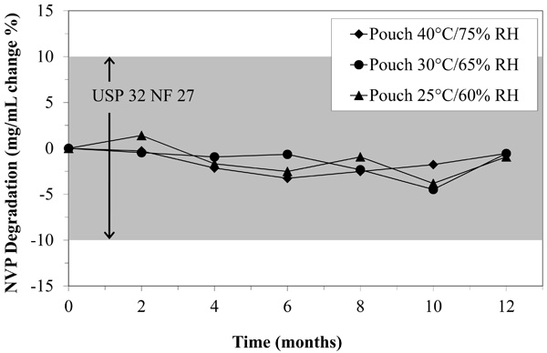 The percent degradation of NVP oral suspension fell well within the USP 32 NF 27 standard even after twelve months in the pouch.
