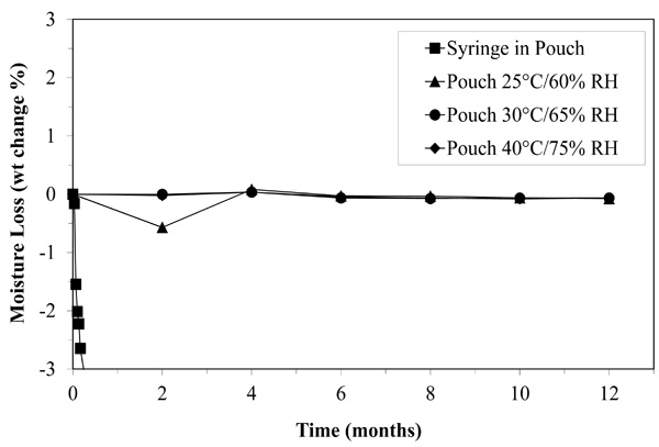 Infant NVP is held in an aqueous suspension by emulsification agents. As mentioned earlier, we suspected that, when stored in a syringe or a syringe inside a foil pouch, moisture loss quickly concentrated the NVP beyond usability. As shown in Fig. (3), when NVP is stored in the pouch, it loses less than 0.7% of its weight over twelve months. In the syringe, moisture is lost well beyond tolerable limits in less than two months (Fig. 3). The pouch nearly eradicated moisture loss.