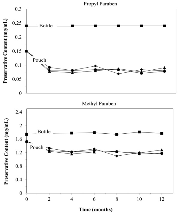 Parabens act as sacrificial oxidants. Their loss may limit shelf life. Despite initial losses attributed to filling and sealing, the sacrificial oxidants remained in adequate quantities to preserve the medication (▲ 25°F/60%RH: ● 30°F/65%RH: ■ 40°F/75%RH).