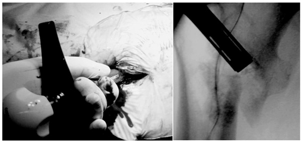 A complex of β-TCP granules, hyaluronate, and rhFGF-2 in a cylinder is injected through the tip of the great trochanter to the base of the lesser trochanter during surgery (A) under fluoroscopy (B).