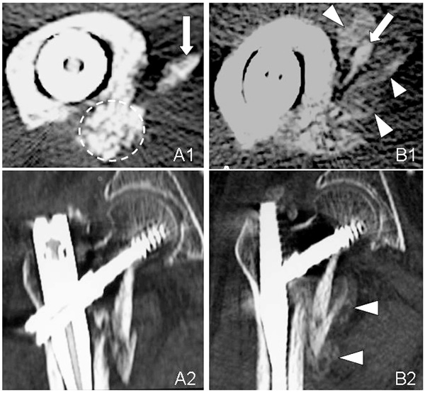 Axial (A1, B1) and sagital (A2, B2) CT images of the unstable intertrochanteric fracture in Case 1. The complex of β-TCP granules, hyaluronate, and rhFGF-2 remains in its original place (broken circle) at 3 weeks (A1). CT image shows marked new bone formation at 6 weeks (B1, B2). The arrows point to the lesser trochanter and arrow heads point callus.