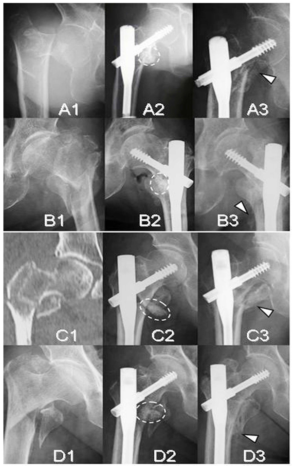 Radiographs and a CT image of four unstable intertrochanteric fracture cases (A;Case 2, B;Case 3, C;Case 4, and D;Case 5). Initial radiographs (A1, B1, C1, and D1). Immediate postoperative radiographs (A2, B2, C2, and D2). Follow-up radiographs at 12 weeks (A3, B3, C3, and D3). Broken ovals indicate the remaining complex of β-TCP granules, hyaluronate, and FGF-2 and arrow heads indicate callus.