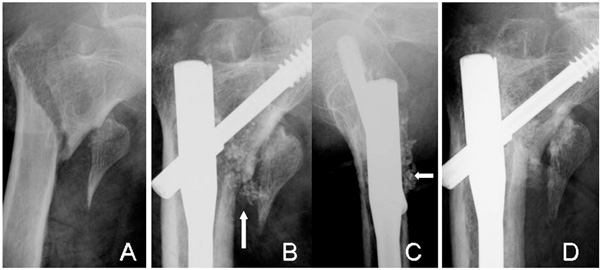 No major adverse effect such as infection was found in any patient. Two weeks after surgery, β-TCP granules were clearly visible in their original place, but new bone formation was not observed. Four weeks after surgery the margins of the β-TCP granules were unclear Figs. (6A, 6B, 6C) and new bone formation was found in 11 cases. By 8 weeks after surgery, most of the β-TCP granules had disappeared and callus formation was seen in all cases. At 12 weeks, union of the intertrochanteric fracture and marked new bone formation were found around the lesser trochanter in all cases (Figs. 3, 5, and 6D). No varus deformity more than 5° was observed.