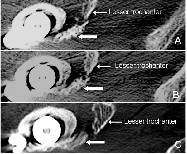 Axial CT images of Case 6. The injectable complex (arrows) has not been replaced by bone at 3 weeks (A). At 8 weeks (B), the complex is partially replaced and is completely replaced by bone at 12 weeks (C). However, it did not reach to the displaced lesser trochanter.