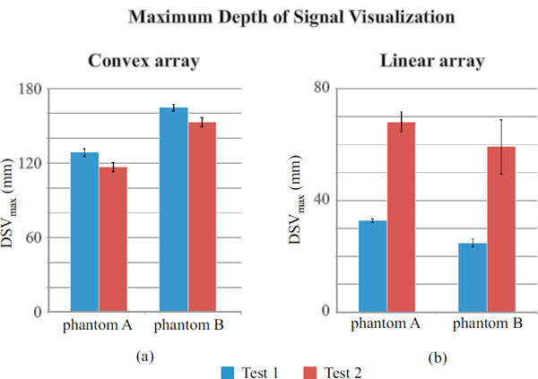 In Fig. (10a) a significant disagreement between phantoms is noticed for both the settings in the convex array probe: higher penetration depths are related to phantom B and measurements uncertainty ranges from ±1 mm to ±4 mm. On the other hand the F-test (p-value<0.05) suggests that homoscedasticity should be refused for phantom B tests. In Fig. (10b) a considerable discrepancy in results between tests and phantom has been observed for the linear array probe: higher penetration depths are consistent to each other and related to settings 2 for both of the phantoms and measurements uncertainty ranges from ±1 mm to ±10 mm, while variances should be considered non-homogeneous between tests for both of phantoms. In the convex array DSVmax seems to depend mostly on phantom model than test settings, on the other hand it is more settings dependent in linear array examinations while differences between phantom tests are not significant. As in the previous sections, a hypothesis test (Kruskal-Wallis) has been carried out to verify whether differences in maximum depth of penetration measurements are statistically significant: p-values are reported in Table 20 and showed significant differences between tests for both the phantoms.