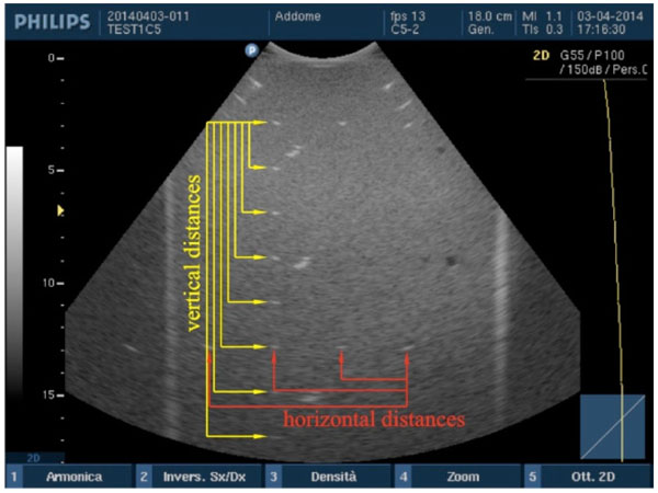 The measurement setup includes an ultrasound scanner Philips HD3, an array probe on the ultrasound phantom and a notebook pc for data acquisition and processing. Tests are performed with two different models of array probe (convex and linear array) on two tissues mimicking phantoms3 (see Table 1 for specifications) by a single operator. In particular, our study focuses on evaluation of the follow image quality parameters: (a) accuracy in distance measurements (both vertical and horizontal directions) [3, 5], (b) high contrast spatial resolution (both lateral and axial resolution) [5] and (c) maximum depth of signal visualization (or maximum depth of penetration) [6-8, 18]. The ultrasound probe is applied on the phantom by hand and its position is manually adjusted to clearly display test objects in the US image (no holder is used), then a single image is acquired and exported on a peripheral in a TIFF or DICOM format (lossless): for each phantom the whole procedure is repeated from 11 to 16 times. Therefore for a same test (Tables 2 and 3) a group of 11 up to 16 ultrasound images is provided and processed by an in-house software package, developed in a Matlab environment [3, 5-10, 15] to evaluate the variation of the parameters (a), (b) and (c) due to the probe manipulation on the phantom surface and whose operating principles are explained in the following paragraphs. The use of self-produced software is mainly due to economic reasons and transparent management of data processing, although comparable products are available on the market [17]. Settings are chosen to display the maximum number of test objects at the central frequency of the ultrasound probe (working frequency). Moreover all images are acquired within ±2° tilt angle, at medium overall gain and linear post processing while persistence, edge enhancement and other image processing are set to minimum.