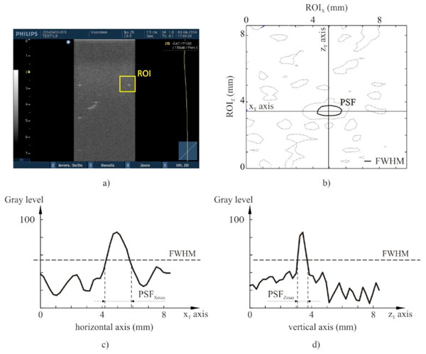 High contrast spatial resolution for each point target. The spatial resolution analysis is performed by an in-house software on gray levels within a ROI of the ultrasound image (a): a threshold algorithm at Full Width Half Maximum is applied to evaluate the PSF (b) and both its maximum width PSFXmax (c) and length PSFZmax (d).