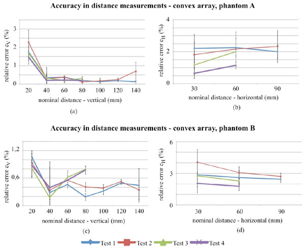 For the convex array transducer the differences between tests in horizontal distance can be attributed to phantom tissue mimicking material and mostly to FoV settings (Fig. 6b and Fig. 6d), because it influences mm to pixel ratio (i.e. scale factor) and the distortion of imaged nylon wires sections. In fact at lower FoVs, wires are selected near to the image boundaries, where distortion artifacts are stronger and become more evident for higher contrasts (i.e. Dynamic Range settings). All the above causes are likely to affect the measurement reproducibility, because of the enhancement of slight differences in the acquired images and their processing by the analysis software. Analogous considerations can be done for the linear array transducer, where high noise levels add dispersion to results. In particular, a singular dispersion is observed for vertical distance error ev in test 4 of Fig. (7a), likely due to a combined effect of the higher attenuation in phantom A and the increased noise with Dynamic Range reduction, that involved a reduced pin target visibility and software failures in barycentric calculus.