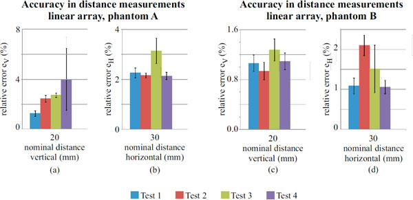 Accuracy in distance measurements for the linear array probe on phantom A and B, evaluated for a 20mm (vertical) and 30mm (horizontal) nominal distances.