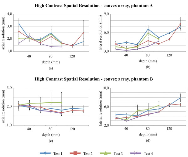 In particular no significant variations between tests have been noticed for most of lateral and axial measurements of the convex array probe (Fig. 8), nevertheless some discrepancies between test can be observed in phantom A. A Fisher test (p-value<0.05) has been performed on parameter variances at 100 mm (both for lateral and axial resolution) and suggests that for results in Fig. (8c and Fig. 8d) (phantom B) homoscedasticity should be excluded. Measurements uncertainty ranges from: ±0.3 mm to ±1.9 mm for lateral resolution, ±0.2 mm to ±1.0 mm for axial resolution. Results of the hypothesis tests on spatial measurements are shown for both probes in Tables 13, 14 and 17.
