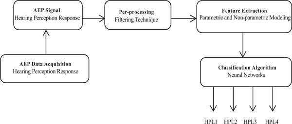 The authors [47-51] addressed the problem by analyzing the complete waveform of AEPs instead of searching the defined peaks. The interpretation of wave (IV, V) is more complex and even small changes in the waveform can lead to large changes in their latency and amplitudes of wave IV and V. The recorded AEP signal contains the deterministic and the stochastic components. Researchers have focused their attention on the changes of the structure of AEP signal or characteristic of AEP signal in determining the hearing threshold level of a person. Shangkai et al. [47] had estimated the AR models for the AEP records of normal hearing and abnormal hearing persons. The estimated hearing thresholds by model parameters were very different dynamic structures from normal and abnormal persons with hearing loss problems. The estimated hearing threshold by parametric model holds good agreement with the audiologist assessment. Sudirman et al. [48] investigated EEG based hearing ability identification level using artificial intelligence. AEP signal was recorded for 10 seconds and collected from temporal lobes (T3, T4, T5, and T6) of the brain. The signals were analyzed using FFT. The extracted features were trained using gradient descendant algorithm with momentum. The feed-forward neural network was used to classify the hearing level based on brain signals. Emre et al. [8] used the continuous time wavelet entropy of auditory evoked potential and characterized by the relative energy in the EEG frequency bands. Continuous time wavelet gives detailed information of AEP response of brain which determines threshold level of a person.