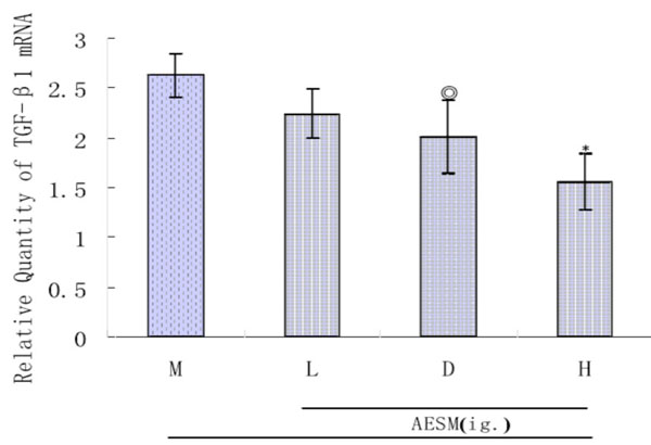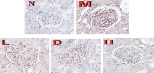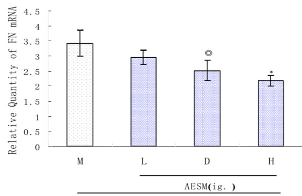 Actively assayed; Immunohistocmical study was adopted to analyze the expression of TGF-R line renal tissue. Moreover, Real-time RT-PCR technology was used to analyze the expression of TGF-R 1 and FN in renal tissue. Comparing results of the model control group, AESM of middle and high dose with remarkably lower level of FBG, kidney index and Ualb (PGO. 05 or PGO. O1), dominantly decreased the expression of TGF-R 1 and FN in renal tissue (PGO. 05 or PGO. O1). It was concluded that AESM can lower the level of FBG, kidney index and Ualb in diabetic rats, down regulate the expression of TGF-R 1 and FN in renal tissue, and regulate the synthesis and degradation of extra cellular matrix. Thus, AESM can alleviate renal pathological lesion, and has a renoprotective effect on diabetic rats (Fig. 2).