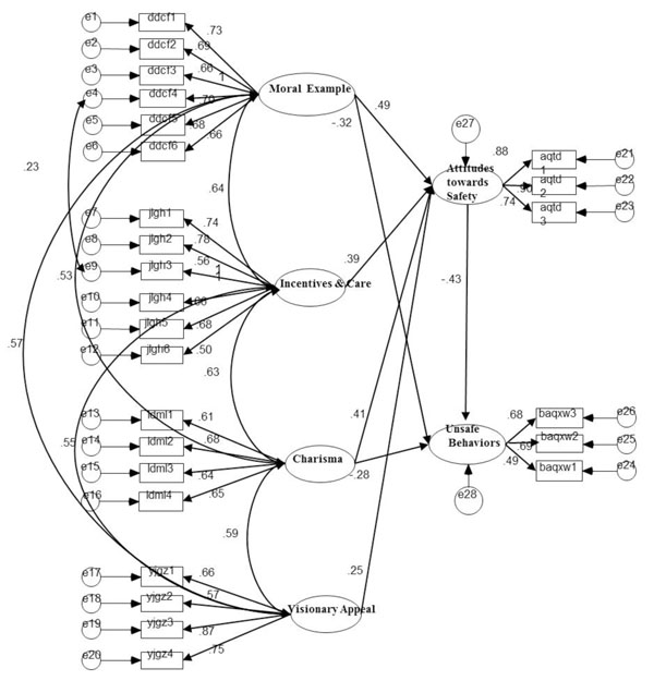 Moral example, incentives & care, visionary appeal and charisma as exogenous latent variables have a negative impact on unsafe behaviors through attitudes towards safety as a mediator. The standardized path coefficient between attitudes towards safety and unsafe behaviors is -0.43;