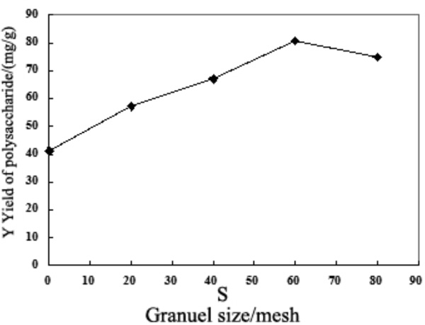 At fixed power of 700 W microwave extraction, microwave time 8 min, the impact of different particle size of the resulting mesh 0, 20, 40, 60, 80 on Salvia polysaccharide yield was examined. The results were shown in Fig. (2).