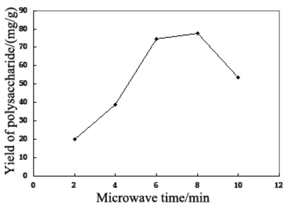 The yield of polysaccharides was gradually increasing during microwave time from 2 ~ 8 min. But during 8 min to 10 min, the polysaccharide yield was decreased. At beginning the polysaccharides amount increased for more cells ruptured. After the salvia particles was treated for 8 min, the polysaccharide in salvia particles was remained less. Therefore microwave to 8 minutes or more, the polysaccharide structure would be damaged to induce yield decline [19].