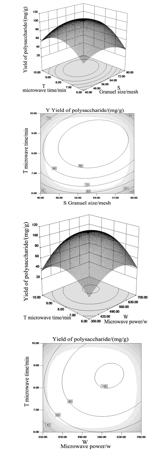 Fig. (5) and combined significance analysis in Table 2, the interaction model between factors S*T and W*T factors was more significant interacted. The significant interaction of S*T may be due to effect of particle size on the dissolution rate of polysaccharides, and microwave extraction time related with the amount of energy absorbed by the cells. While the energy would have a effect on speed of cell broken and polysaccharides dissolution. But when polysaccharides dissolution over, Salvia miltiorrhiza granule was still microwaved. Too much energy it will destroy the polysaccharide structure. And as a result yield declines. So the interaction between granule size and microwave time would changes the yield of polysaccharides. The significance of interaction between W and T may be due to the impact of polysaccharides can complete dissolution for enough microwave time, and the microwave power will affect the rupture speed of cell wall, time will enhance this effect, but too high of the power and too long of the time will cause the accumulation of too much energy. they undermine the polysaccharide structure, thus affecting the yield of polysaccharides.